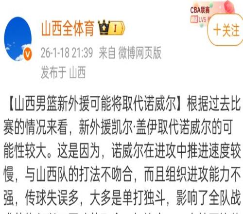 山西男篮随着奈特的加盟和张宁复出,球队的状况得到了提升,不过他们还是决定更换外援,凯尔盖伊已经完成了签约,根据多位山西媒体人透露,本赛季初期表现不错的诺威尔会被换掉,山西男篮本赛季想要冲击更好成绩,其实还需要一个更优秀的内线中锋。