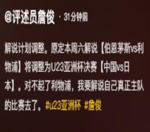 詹俊写道:解说计划调整。原定本周六解说【伯恩茅斯vs利物浦】将调整为U23亚洲杯决赛【中国vs日本】。对不起了利物浦,我要解说自己真正主队的比赛去了。