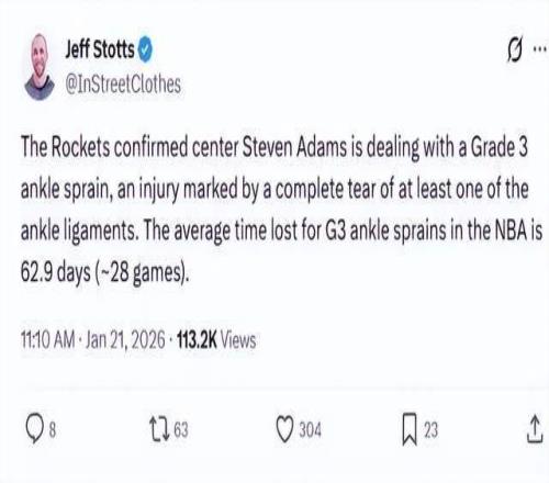 此前对阵鹈鹕的比赛中,亚当斯在篮下踉跄倒下,赛后伤病报告显示,脚踝三级扭伤,至少休息三到六个月。