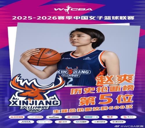 1月21日,新疆女篮老将赵爽全场贡献3次抢断,WCBA生涯总抢断次数达到了601次,成为第5位生涯抢断次数超过600次的球员!