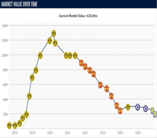 19岁时桑乔的巅峰身价达到过1.3亿欧,当时他效力德甲多特蒙德。2021年多特将桑乔卖给曼联,转会费8500万欧,那一年21岁的他身价也有1亿。