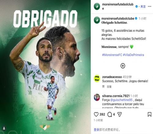 莫雷拉人晒出了吉列尔梅的海报,并配文写道:“谢谢你,吉列尔梅,效力球队期间你共打进15球,助攻6次。愿你一切顺利!”
