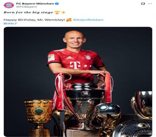 拜仁官方社媒晒出罗本与奖杯的合照,配文:“为大场面而生,生日快乐,温布利先生!”