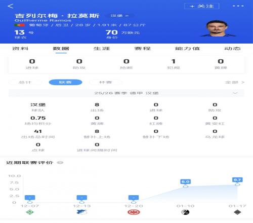 吉列尔梅·拉莫斯曾效力葡萄牙体育、比勒菲尔德等队,2023年加盟汉堡,本赛季代表球队出战8场德甲共计41分钟,他的德转身价为70万欧。据德国媒体《图片报》报道,球员转会费为10万欧。