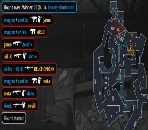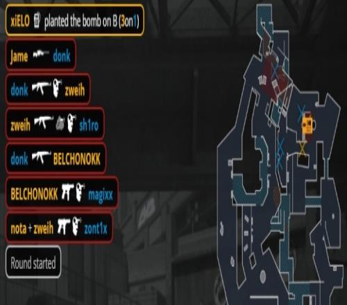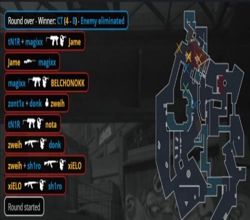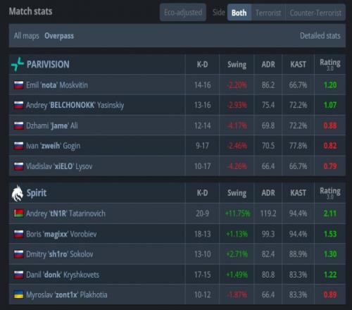 易边再战,手枪局Spirit冲A下警家包,donk双杀被xiELO补掉,sh1ro双杀收尾,Spirit拿到第9分。次回合PV存钱,tN1R咖喱特三杀拿到第10分。回到长枪局,Jame在B二楼M4三杀拿到第5分。回到长枪回合,残局A包点2v2磕枪,zont1x先杀Zweih再杀BELCHONOKK拿到第11分,紧接着PV存钱送出赛点。