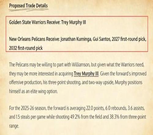 美媒《Fadeaway Wolrd》撰文建议,勇士应该将库明加、桑托斯、2027年以及2032年的首轮签送到鹈鹕,换回墨菲。