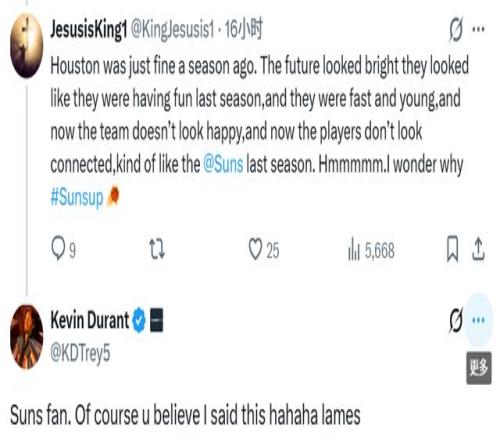 杜兰特也回复这位球迷:“太阳队的球迷啊。难怪你会信这种话是我说的,哈哈,真没劲!”