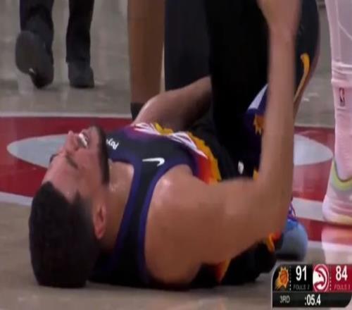 而在第三节,独自带队的布克在一次拼抢中不慎踩到了老鹰队内线奥孔古的脚,导致他自己的脚出现90度崴伤,一声惨叫,倒在地上。布克已经无法依靠自己的力量站起来,只能在队友的搀扶下退出比赛。