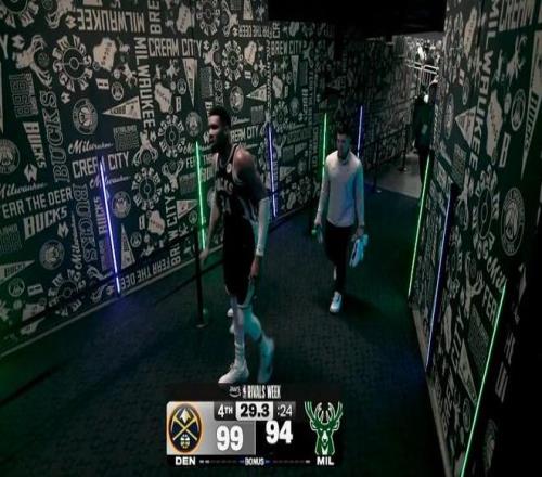 保护了自己全场,结果最后时候受伤,字母哥非常沮丧,默默就走回了更衣室。结果往更衣室走的时候,突然听到场上在欢呼,他又走回替补席坐在板凳席上看球。但是可以看到字母哥非常难受,捂着自己的脸很痛苦。