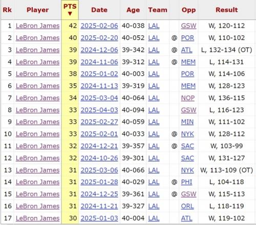 2024-25赛季,从39岁迈向40岁的詹姆斯17次砍下30+。