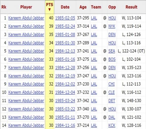 1984-85赛季,37岁的贾巴尔曾14次砍下30+。