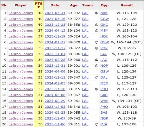 2023-24赛季,从38岁迈向39岁的詹姆斯20次砍下30+,其中有3场40分。