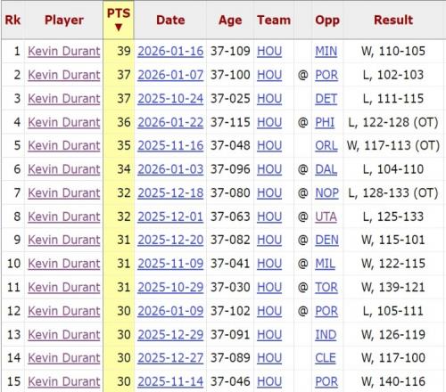 今天结束的一场NBA常规赛,火箭111比104击败活塞。杜兰特此役发挥出色,出战41分钟,19投11中,三分11中5,罚球6中5砍下32分7篮板3助攻1抢断1盖帽,全场零失误。这是KD本赛季第16次砍下30+,在37岁还能单赛季16次30+,这在NBA的历史上是少见的。