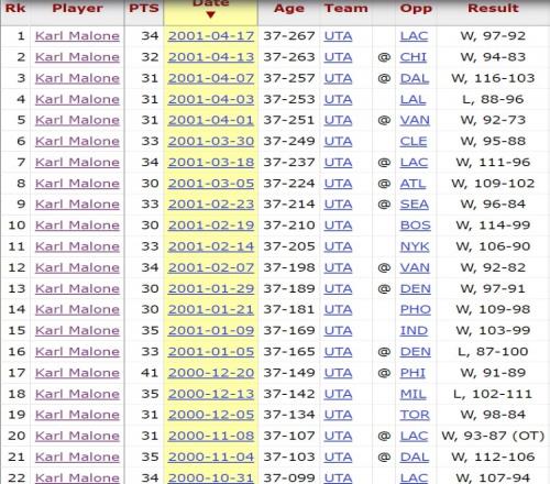 2000-01赛季,37岁的卡尔·马龙22次砍下30+。