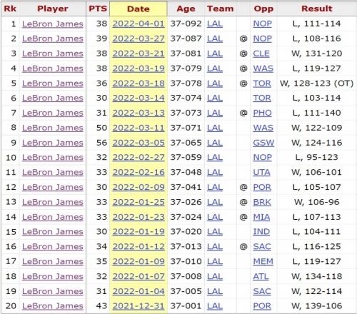 2021-22赛季,从36岁迈向37岁的詹姆斯20次砍下30+,值得一提的是,这20次30+老詹都是在满37岁后砍下的。