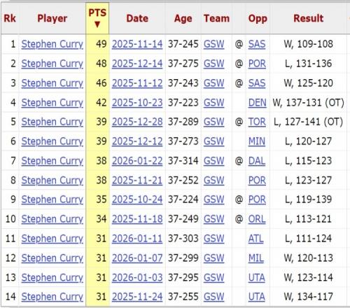 赛季至今,库里出战36场,已经14次砍下30+,其中,在去年11月对阵马刺的比赛中,库里砍下49分。