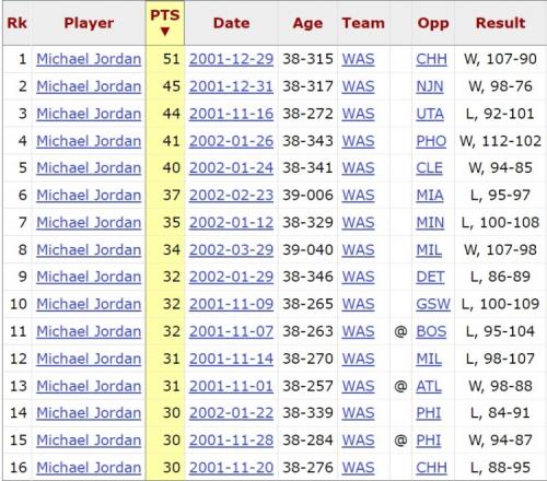 2001-02赛季,乔丹16次砍下30+。其中,2001年12月对阵夏洛特黄蜂的比赛,MJ爆砍51分。