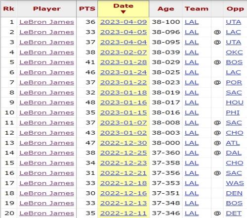 2022-23赛季,从37迈入38的詹姆斯25次砍下30+,其中包括5场40+,2023年1月对阵火箭的比赛,老詹爆砍48分。