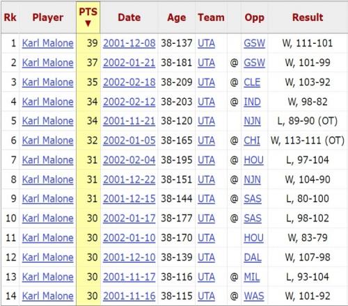 2001-02赛季,38岁的马龙曾14次砍下30+。