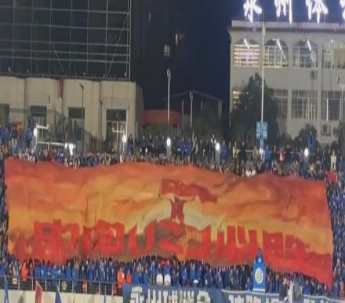 据记者牛志明报道,在CMG群众足球邀请赛现场,球迷为U23国足制作tifo:中国U23必胜!