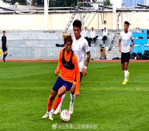 今天下午,在海口冬训的山东泰山队与青岛西海岸队进行了一场热身赛,本场比赛上下半场各35分钟。泰山队由刘骐玮、王彤、赵剑非、杨瑞琦、吴兴涵、梅帅军、尹嘉熙、邓淳泽、陈蒲、路俊伟和买乌郎首发。上半场陈蒲中路断球后直塞邓淳泽,后者面对守门员打门偏出立柱。此后双方互有攻守,以 0:0 的比分结束上半场比赛。下半场,泰山队做出换人调整,刘彬彬、郑铮、王昊斌和闫恒烨替补登场。青岛西海岸队率先在混战中抢射破门,一分钟后陈蒲造点并亲自主罚命中扳平比分,临近比赛结束,青岛西海岸队抓住反击机会打入一球完成反超。最终山东泰山1:2不敌青岛西海岸。
