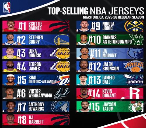 体育播报1月24日宣 NBA Canada发布了基于加拿大NBAStore的球员球衣上半赛季销售数据。猛龙球员斯科蒂·巴恩斯排名第一,库里排名第二,东契奇排名第三。