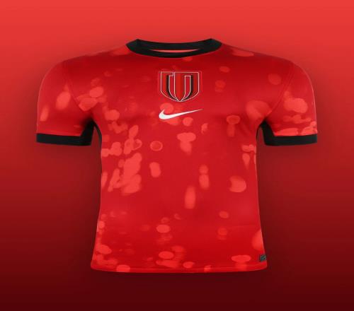 新赛季成都蓉城主场球衣以城市夜色为灵感,整体以红色为主,辅以黑色细节点缀,将流动的光影转化为遍布全身的虚化光斑图案,营造出动态视觉效果。