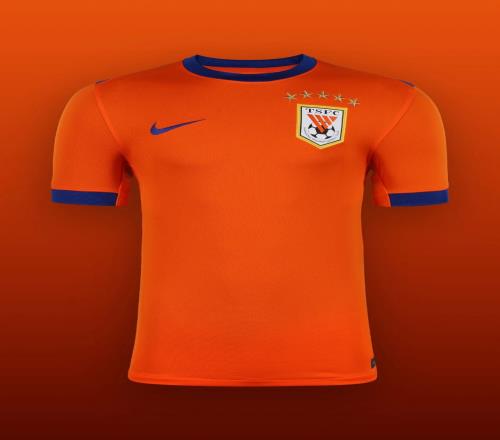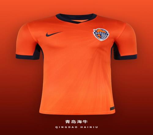 新赛季青岛海牛主场球衣通过由队徽向外延展的光影纹样呈现球队的速度与活力。亮橙色辅以深蓝色点缀相互呼应,使视觉层次更加清晰且富有张力。