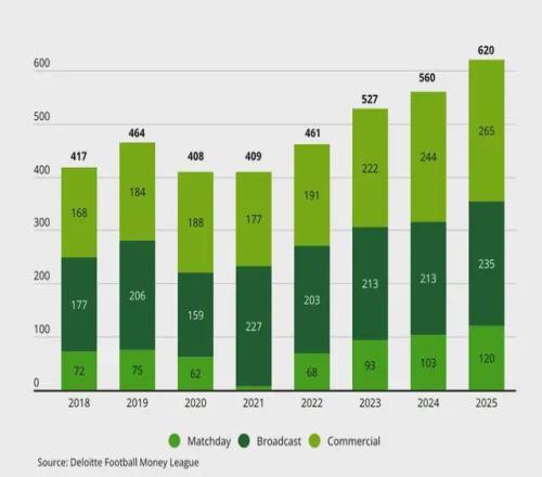 连续三年的数据或许可以说明一个现象:职业足球俱乐部的营收长期以来被认为是一个高度依赖转播版权的行业,然而德勤的数据告诉大家,在转播版权市场处于高度饱和、增长乏力的情况之下,商业收入取代了媒体版权,成为了职业足球俱乐部的增长新引擎。