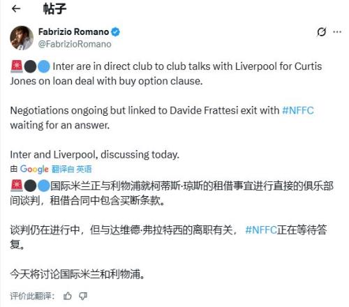 罗马诺在X(推特)上表示:“国际米兰正与利物浦就柯蒂斯·琼斯的租借交易进行了俱乐部层面谈判,该交易包含购买选择权条款。谈判正在进行中,但与弗拉泰西的离队相关,诺丁汉森林正在等待答复。”