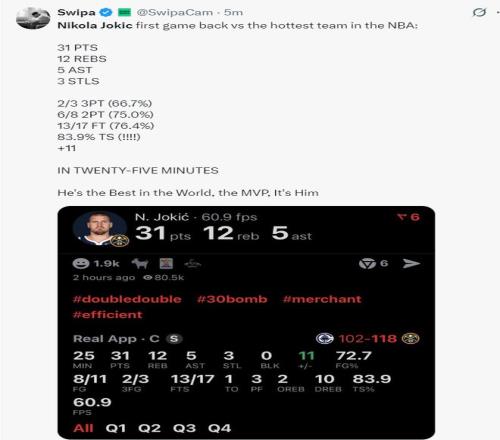 尼古拉-约基奇自12月30日受伤后,他已经足足休息了32天,他合计缺席了16场常规赛,他之后只有一场的空间不然就无缘评选常规赛MVP、最佳阵容等奖项,他复出的这个时限肯定也是为了评奖。首节约老师登场就展现了极强的统治力,4中3+三分1中1拿到9分4篮板1助攻。