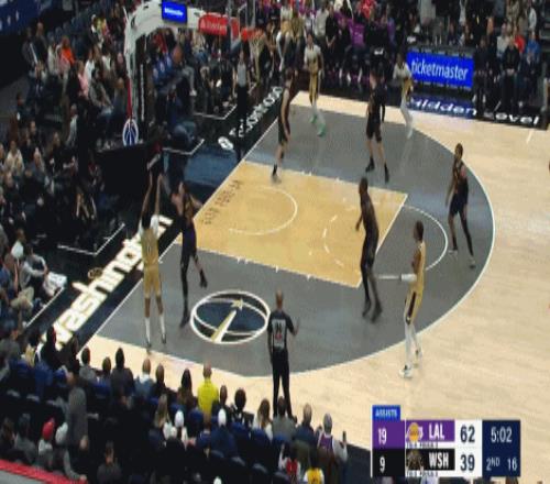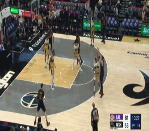 在东子三双的率领下,湖人全军出击,万箭齐发,半场湖人77-48领先奇才29分,直接打花了比赛。