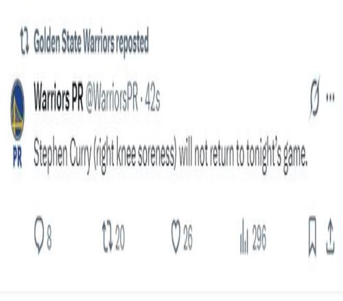 勇士官方:斯蒂芬-库里的右膝仍有疼痛症状,他将缺席本场比赛的末节。
