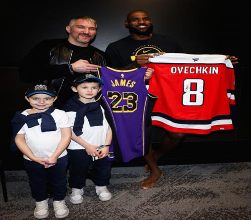 NHL华盛顿首都人队官推晒出一段本场观战的首都人队球星亚历克斯·奥维契金赛后与湖人前锋詹姆斯交换签名球衣的互动片段。