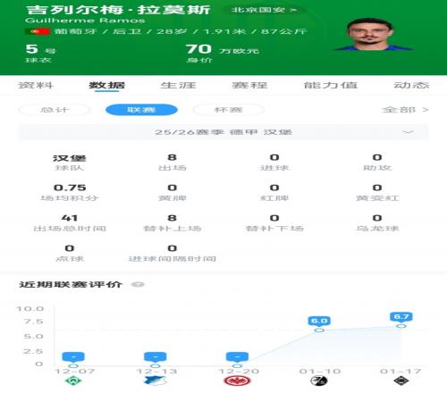 吉列尔梅·拉莫斯曾效力葡萄牙体育、比勒菲尔德等队,2023年加盟汉堡,本赛季代表球队出战8场德甲共计41分钟,他的德转身价为70万欧。