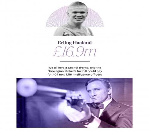 据榜单数据显示,曼城前锋哈兰德周薪约50万英镑,年度奖金高达1000万英镑,以每年缴纳1690万英镑的税款位列榜单第72位。哈兰德也是这份榜单中最年轻的人(25岁)。