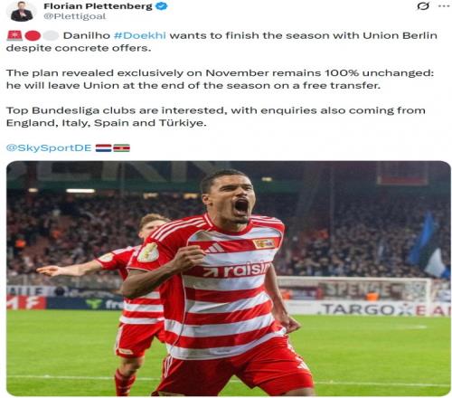 报道称多基的计划一直没有发生改变,他将在赛季结束后以自由身离开柏林联合。来自德甲的豪门对他表示出兴趣,同时也有来自英格兰、意大利、西班牙和土耳其的球队询问他的情况。
