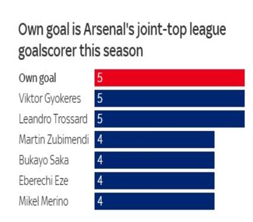 在队内射手榜上,乌龙球、约克雷斯、特罗萨德以5球并列榜首,苏比门迪、萨卡、埃泽、梅里诺以4球排名其后。在队史上,阿森纳本赛季也以5球追平了2023-24赛季,在阿森纳队史上仅次于2009-10(6球)。