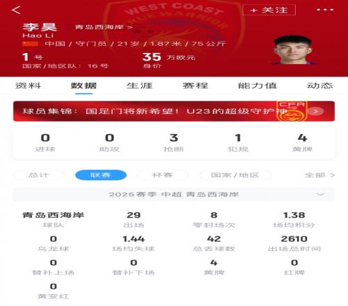 1月的U23亚洲杯上,李昊代表U23国足打满全部6场比赛,贡献33次扑救断层领跑。上赛季中超,李昊代表青岛西海岸出战29场比赛,贡献8次零封,丢掉42球。