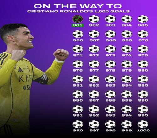 昨日的沙特联第19轮,利雅得胜利3-0击败十人拉斯永恒,C罗破门,打进生涯第961球,距离1000球里程碑还差39球。