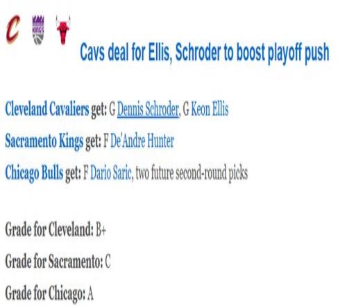 随后,ESPN为这笔交易进行评级,公牛获评A,骑士获评B+,国王的评级最差,只有C,以下是具体解析——