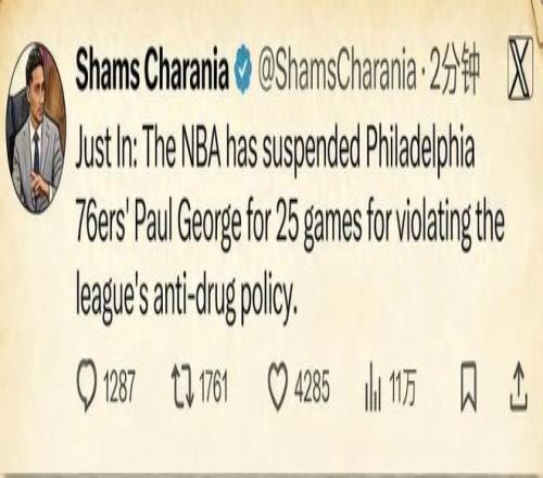 爆料王Shams:乔治因违反联盟禁药政策将被禁赛25场比赛......该消息已经得到NBA官方的确认。是的,就是费城的乔...