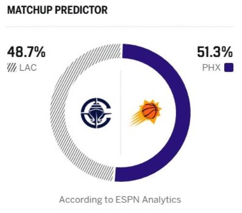 ESPN今日晒出本场胜率预测,快船为48.7%,太阳为51.3%。