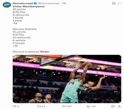 而跟文班亚马对位的2022年次轮43顺位的中锋迪亚巴特,全场比赛33分钟,9中6,拿到12分10篮板6助攻2盖帽,命中率66.7%,正负值+17,文班亚马2.24米,迪亚巴特只有2.08米,两人的强硬程度完全不同。