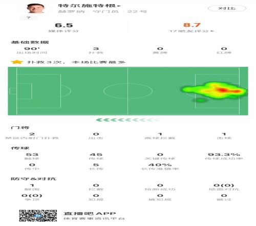 尽管特尔施特根本场首发并为赫罗纳作出3次扑救,但他仍连续两轮未能实现零封,赫罗纳也从三连胜势头变为近两轮只拿1分。
