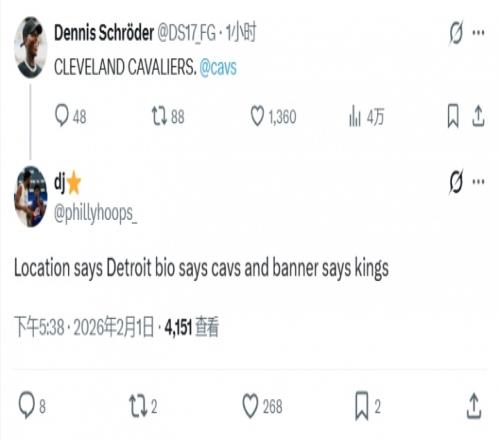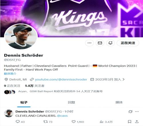 施罗德此前更新个人X,写道:“克利夫兰骑士@骑士官推。”