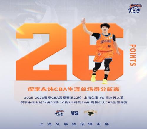 体育播报2月1日宣 CBA常规赛,上海114-80击败同曦。本场比赛,偰李永炜出场24分钟,拿到26分1篮板1助攻,正负值+20。