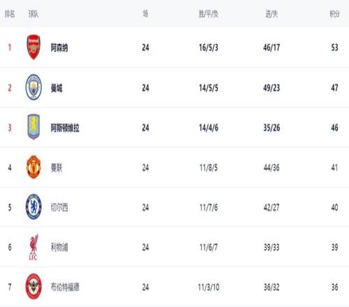在积分榜上,阿森纳依然高居榜首,拿到53分。阿森纳的两大争冠劲敌曼城和维拉都丢分了。曼城总积分是47分,落后6分,排名第2。而阿斯顿维拉依然是46分,排名第3。曼联杀入欧冠区,总积分41分,排名第4。切尔西以40分排名第5。利物浦只拿到39分,掉到了第6的位置。