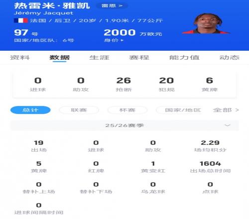 20岁的雅凯在场上司职中后卫,目前他效力于法甲雷恩,他的德转身价为2000万欧元。