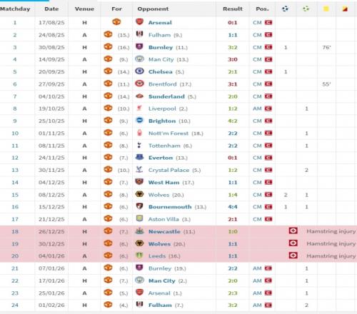B费在阿莫林治下,17场英超其中16场是后腰,1场是前腰,17场总数据是5球7助攻。